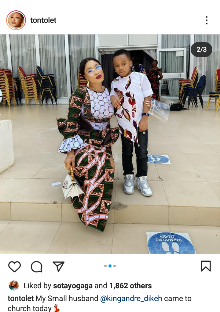 Few hours ago, Tonto Dikeh took to her verified instagram account to post pictures of herself and her small husband. She quoted her post with the caption, “my small husband came to church today”. Her new pictures stirred reactions as her fans comment and liked her post.