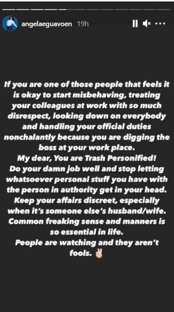 In an Instastory session that she recently launched on her official Instagram page, the actress described ladies who treat fellow employees with disrespect and exhibit a nonchalant attitude at work simply because they are in a romantic relationship as trash. Angela also warned ladies like this not to let the position they occupy in the life of their bosses get into their head, as the case may be.