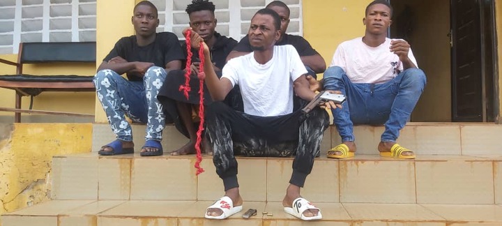 The Delta state police force, thwarted the initiation ceremony of the suspected cult group on Tuesday. It is believed by the Delta state police command that the suspected cult boys belongs to the Aiye confratenity in ukwuani area of Delta state. As the police nabbed the boys, some arms were also recovered from them. Below are some pictures of the boys;