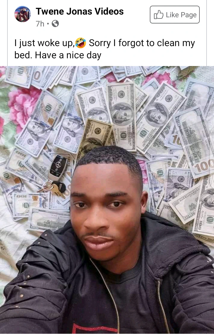 He has done that again in a new style. This time around, he spread the money on his bed whilst taking a picture with it. After that, he posted the photo on one of his facebook pages with the caption ‘I just woke up. sorry, I forgot to clean my bed’.