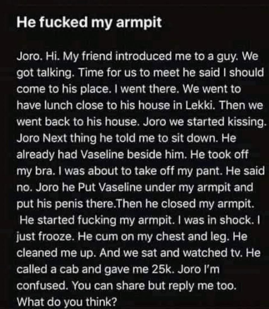 However, after she visited, and they were getting intimate, she thought they will be having seks but the guy then inserted his d in her armpit and started to fakk till he ejaculated.
