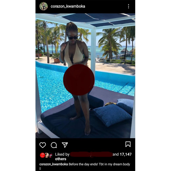 It all started after Corazon shared a throwback photo of herself relaxing by the pool in Mombasa with the caption, “Before the day ends. TBT in my dream body. ”