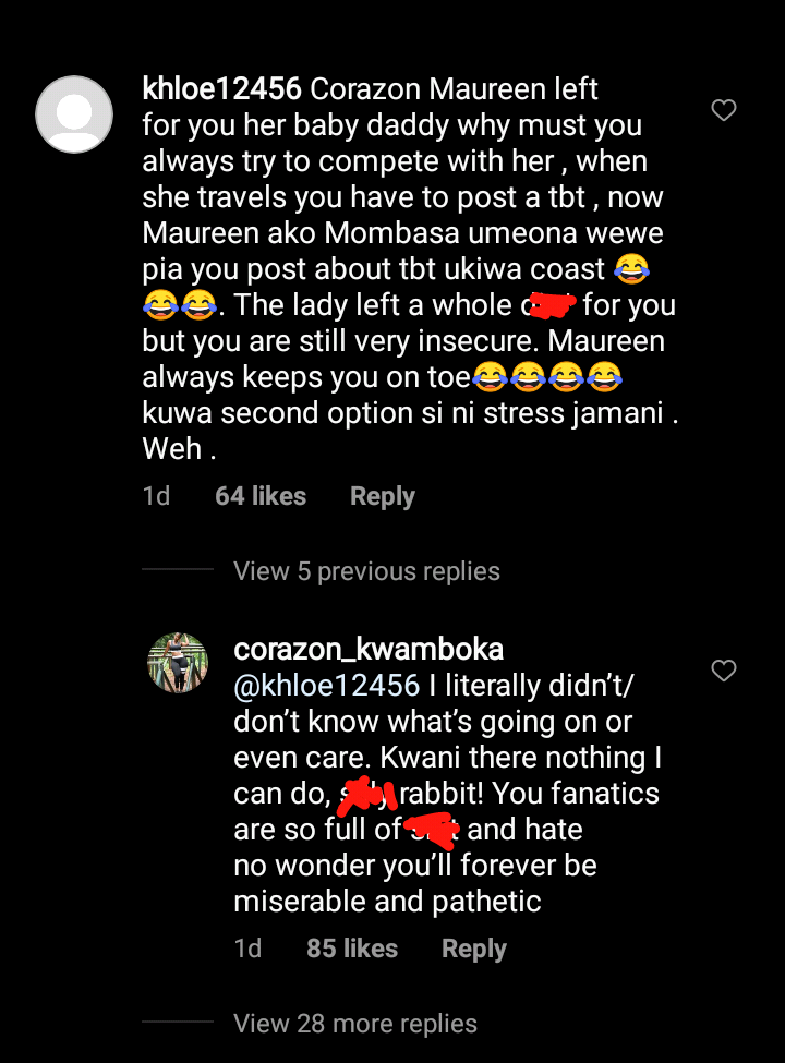 The fan wrote, “Corazon Maureen left for you her baby daddy. Why must you compete with her, when she travels you have to post a tbt. Now Maureen ako Mombasa umeona wewe pia you post about tbt ukiwa coast”