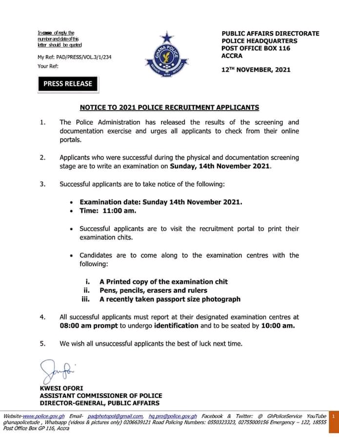 The Police Service made it known to the the public that, all those who qualified to take part of the exams will see their statuses on their portals and they should print an examination chit on their portals and bring it to the examination centres at exactly 8:00 am.
