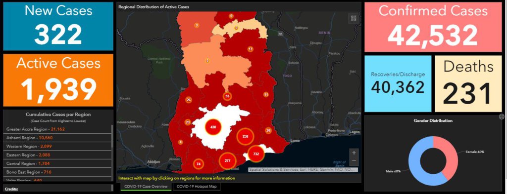 Ghana has recorded 322 new cases of the novel coronavirus taking the country’s tally to 42,532.