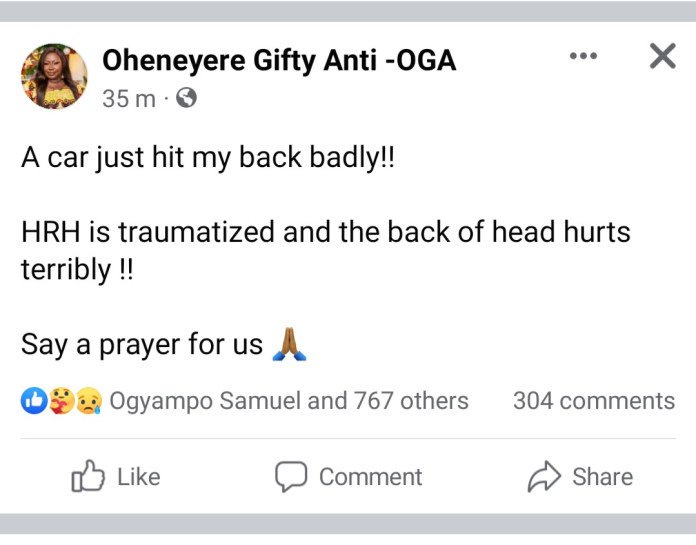 Taking to her Facebook page, Gifty Anti explained how a car hit her back badly and how she was hurt and traumatised.