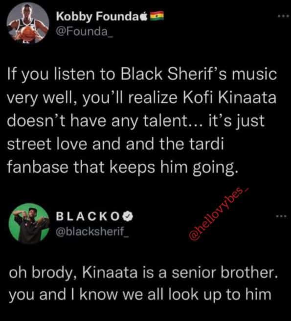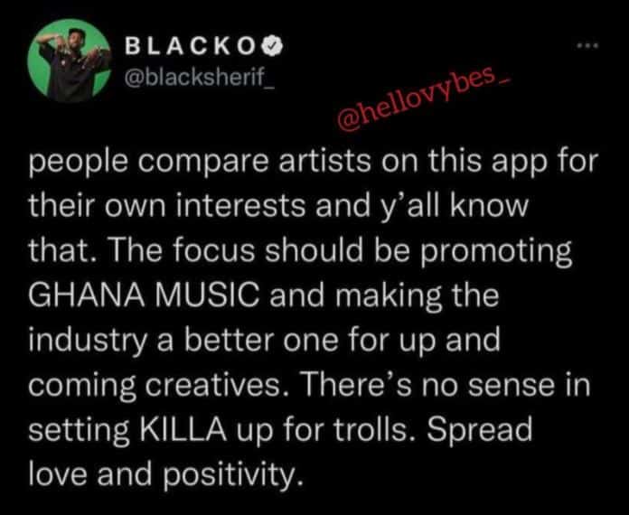 In a tweet, the hatemonger with the name Kobby Founda intended to spite Blacko against songwriter, Kofi Kinaata by comparing the two artists saying the latter doesn’t possess any talent.