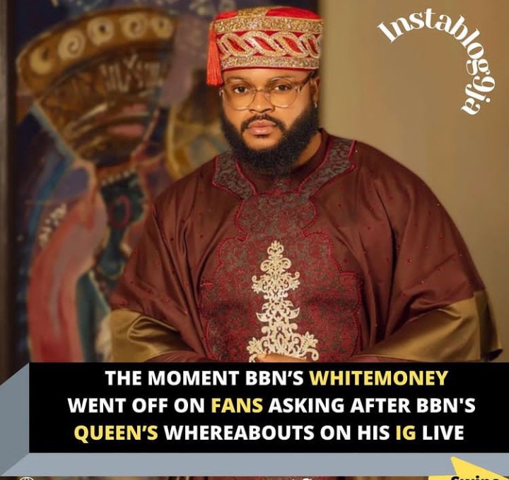 In a recent Instagram live video, Big Brother Naija winner, White Money went off on fans who asked him of Queen’s whereabouts. He further told them to contact Queen, if they wish to know how she is faring.