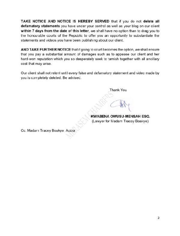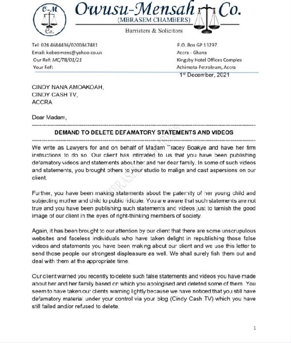 The letter which was signed by Kwabena Owusu-Mensah Esq. stated plainly that this warning has become necessary after his client, Tracey Boakye informed him that all strategies about by her to get Cindy Nana Amoakoah who owns Cindy Cash TV has proved futile.