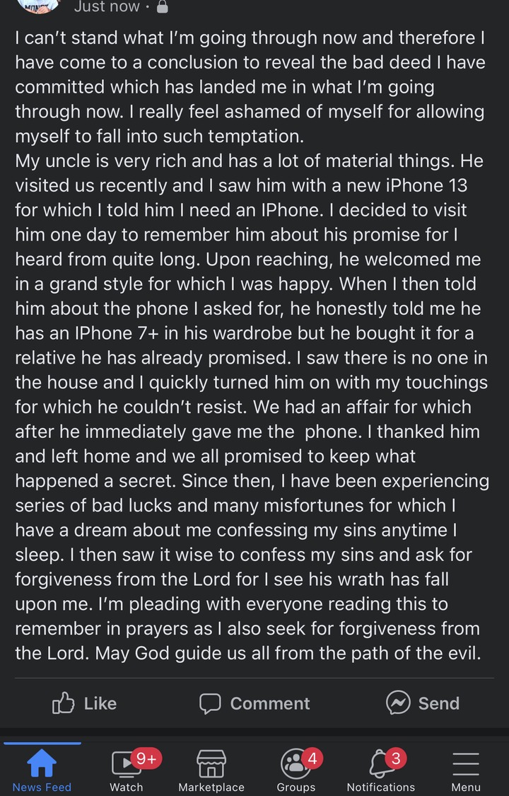 It is said that, man can never run away from evil for our predecessors were also not able to resist evil temptations which tends to trend among generations. A lady has taken to Facebook a post confessing her sinful act she indulged in with her uncle all because of an iPhone. She has indeed regretted her actions as she shared the story. This is what she shared: