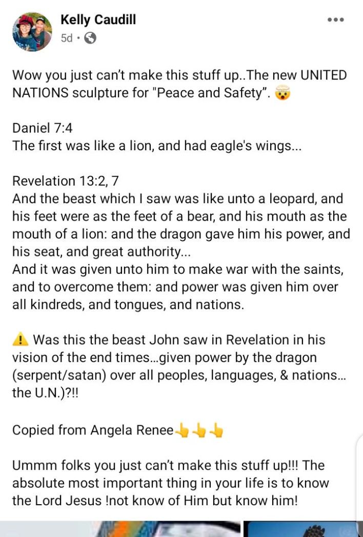 “Was this the beast John saw in Revelation in his vision of the end times…given power by the dragon (serpent/satan) over all peoples, languages, & nations…the U.N.)?!! Copied from Angela Renee,” she wrote.