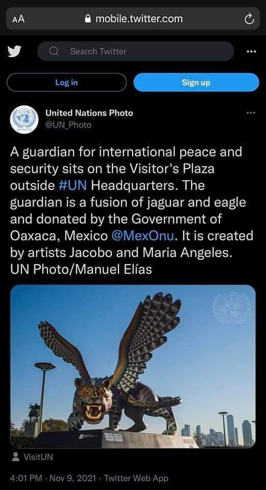 “A guardian for international peace and security sits on the Visitor’s Plaza outside #UN Headquarters. The guardian is a fusion of jaguar and eagle and donated by the Government of Oaxaca, Mexico.”