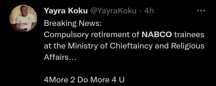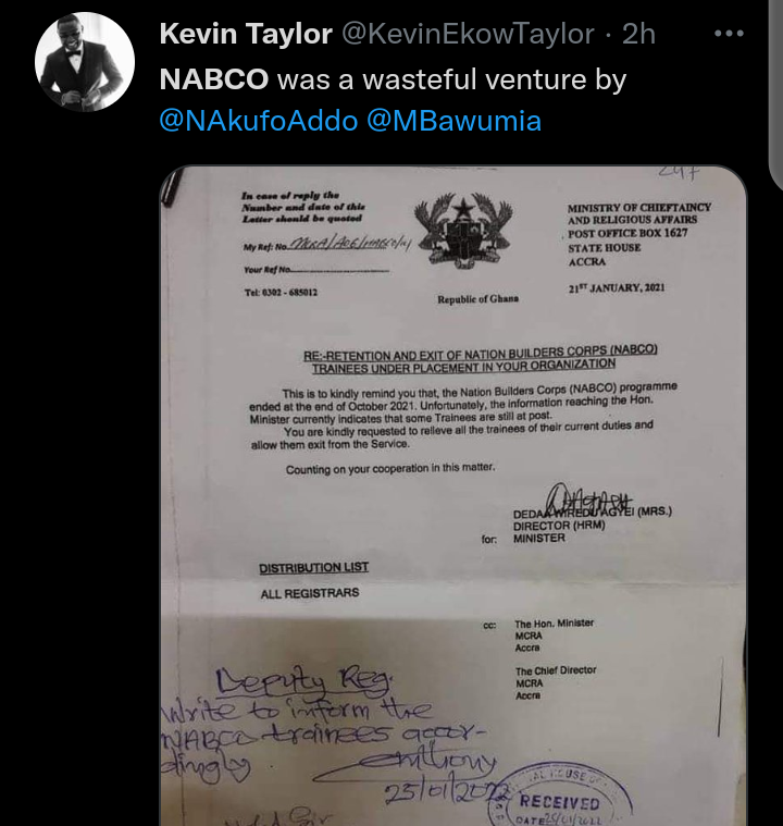 “This is to kindly remind you that, the Nation Builders Corps (NABCO) program ended at the end of October 2021. Unfortunately, the information reaching the honorable Minister currently indicates that some trainees are still at post.”