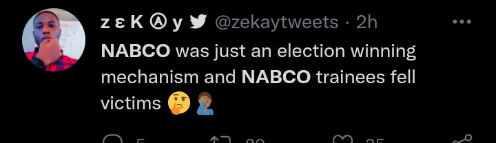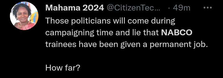 After the NABCO program ended in October 2021, they were called back and are currently, the government owes them about four months of their allowance. This, a lot of the trainees have cried about and complained bitterly to the government.