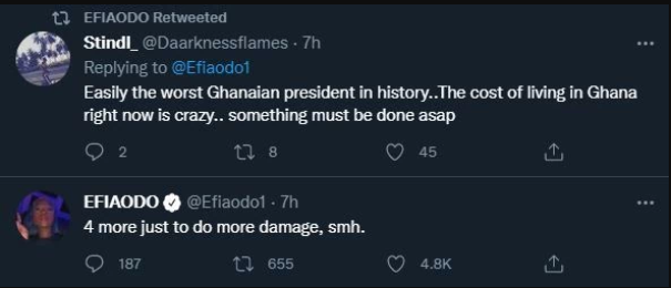 Efia tweeted; “Easily the worst Ghanaian president in history. The cost of living in Ghana right now is crazy.. something must be done asap.”