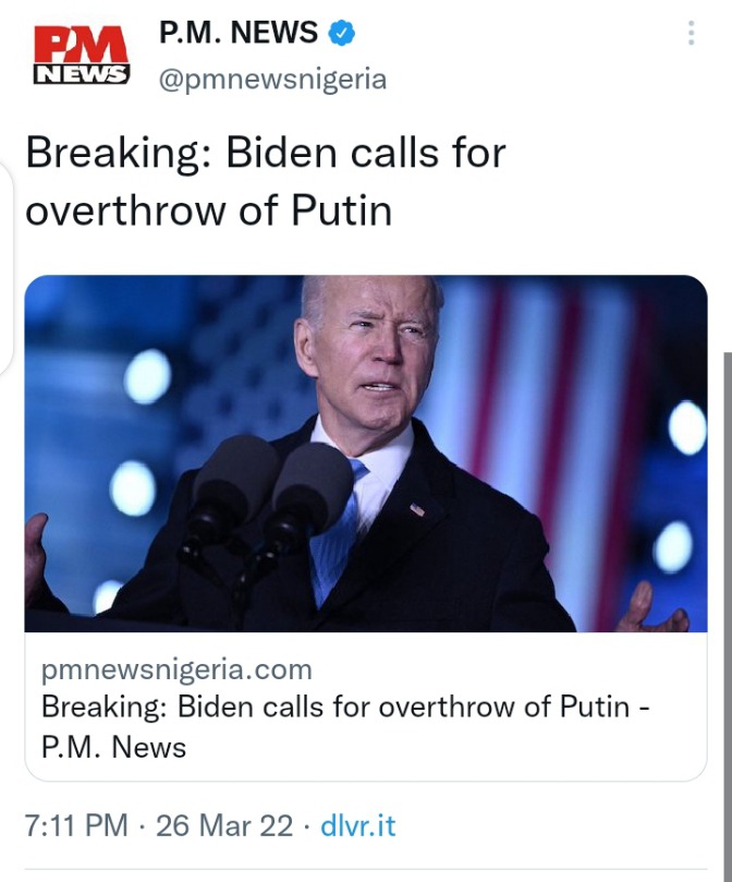 U.S. President Joe Biden on Saturday called for Russian leader Vladimir Putin’s removal, saying, “For God’s sake, this man cannot remain in power.”